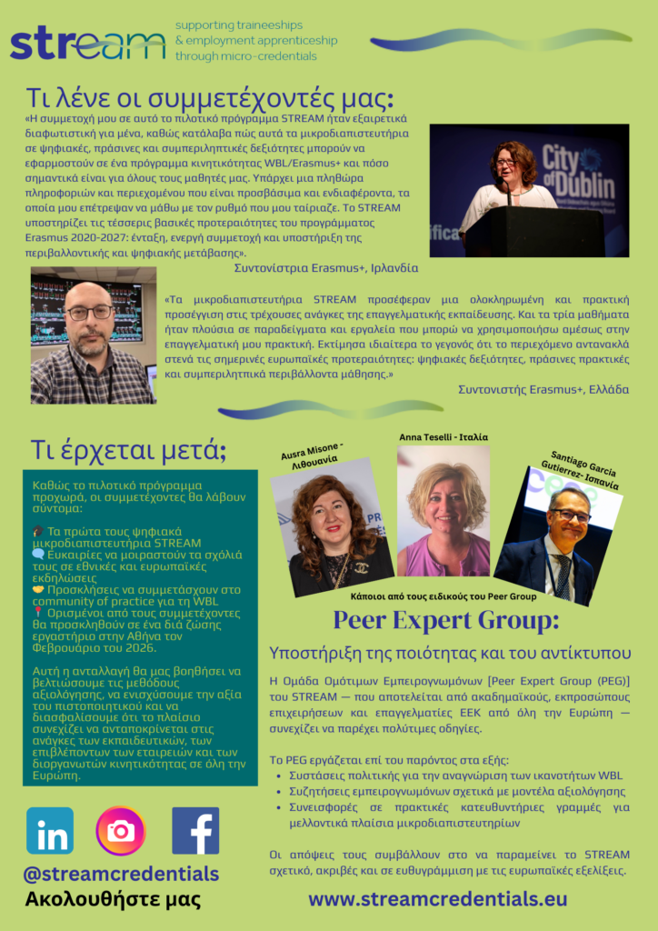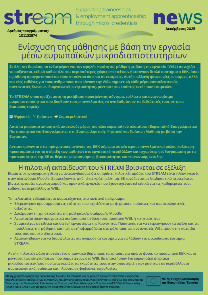 Το έργο STREAM είναι ένα νέο Ευρωπαϊκό Πρόγραμμα Erasmus+ (Project 101132874) που στοχεύει στην υποστήριξη των εκπαιδευτών της ΕΕΚ και των μεντόρων των επιχειρήσεων για μια υψηλής ποιότητας Μάθηση με βάση την εργασία (Work Based Learning).