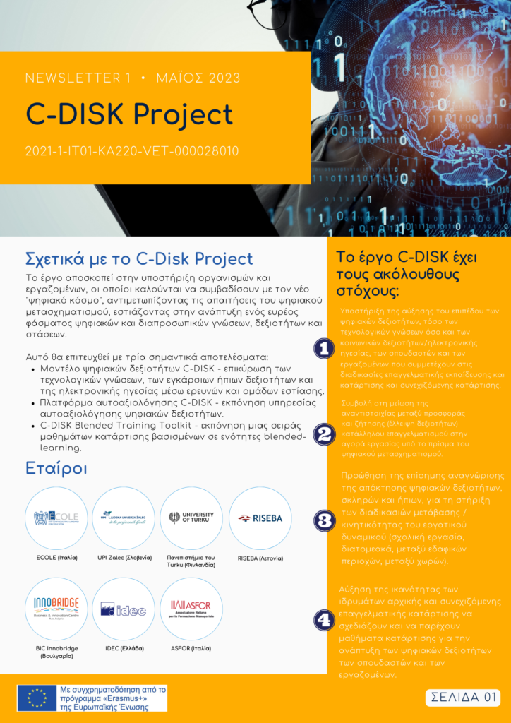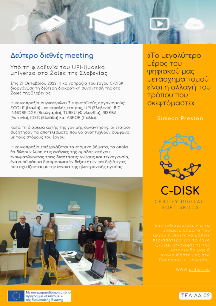 Δείτε παρακάτω το πρώτο newsletter του προγράμματος C-DISK το οποίο παρέχει μια εισαγωγή στους στόχους του προγράμματος, ενώ αναφέρεται και στο πρώτο meeting της ομάδας του προγράμματος στο Zalec της Σλοβενίας!
