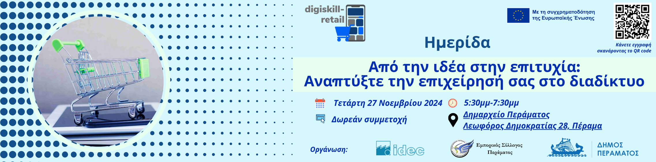 Η IDEC Α.Ε, σε συνεργασία με τον Δήμο Περάματος και τον Εμπορικό Σύλλογο Περάματος, σας προσκαλούν στην ημερίδα με θέμα «Από την ιδέα στην επιτυχία: Αναπτύξτε την επιχείρησή σας στο διαδίκτυο» που θα πραγματοποιηθεί την Τετάρτη 27 Νοεμβρίου 2024 και ώρες 5:30μμ – 7:30μμ, στo Δημαρχείο Περάματος