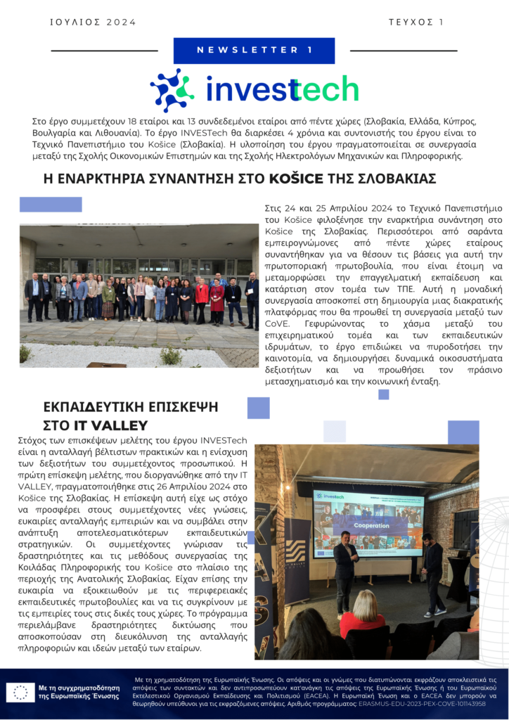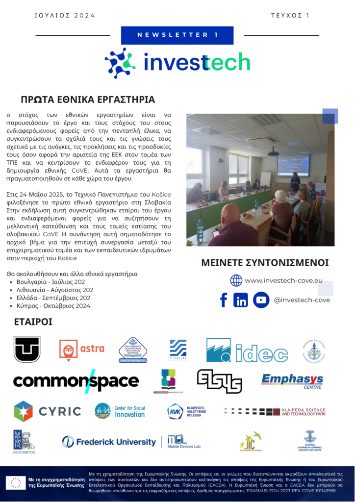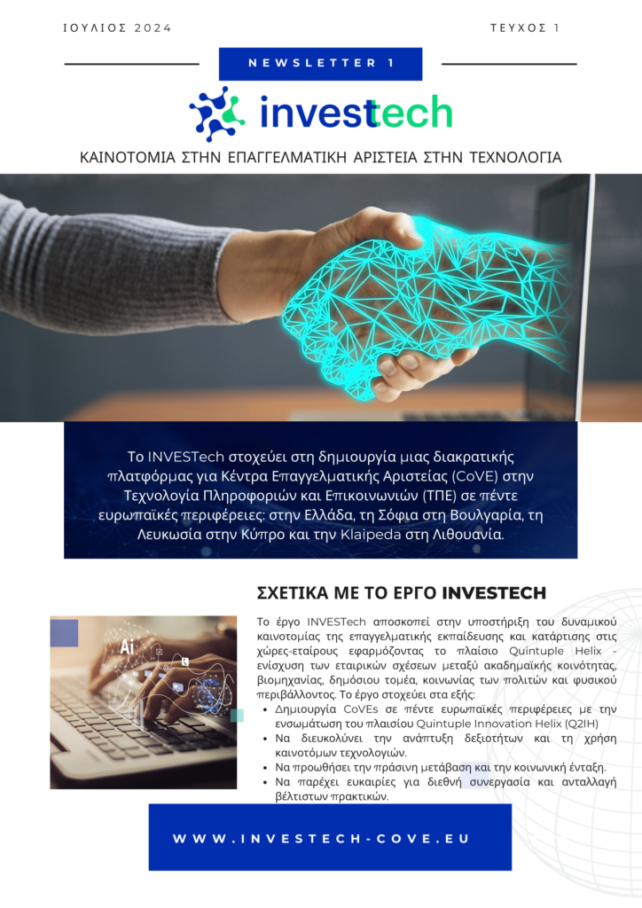 Το έργο INVESTECH είναι ένα νέο Ευρωπαϊκό Πρόγραμμα Erasmus+ (Project 101143958) που στοχεύει στην εδραίωση και ανάπτυξη μιας διεθνικής συνεργατικής πλατφόρμας των Κέντρων Επαγγελματικής Αριστείας (CoVEs) στο πεδίο Τεχνολογίας Πληροφοριών και Επικοινωνιών (ICT) σε πέντε ευρωπαϊκές χώρες: Σλοβακία, Ελλάδα, Βουλγαρία, Κύπρο και Λιθουανία.