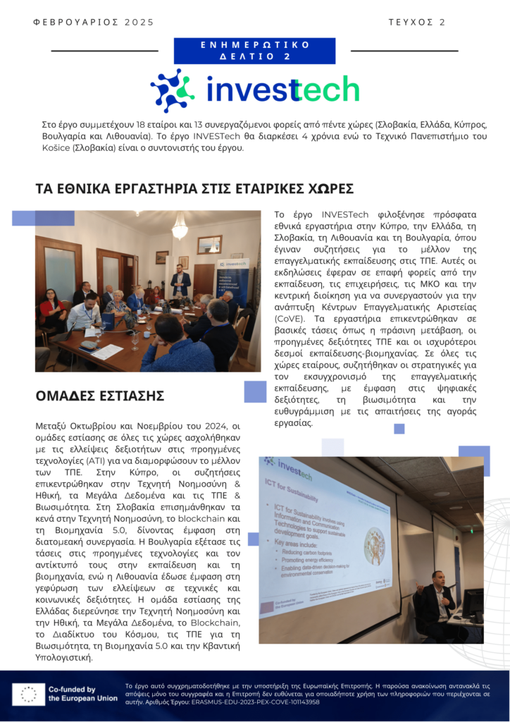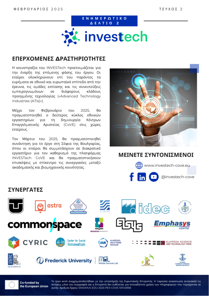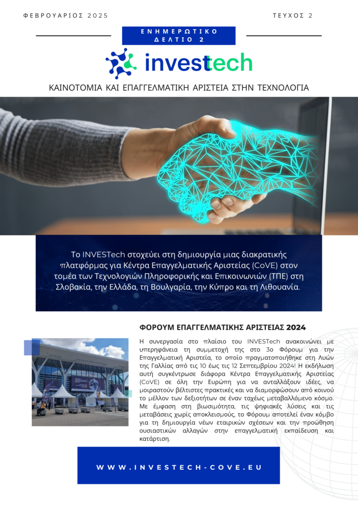 Το έργο INVESTECH είναι ένα νέο Ευρωπαϊκό Πρόγραμμα Erasmus+ (Project 101143958) που στοχεύει στην εδραίωση και ανάπτυξη μιας διεθνικής συνεργατικής πλατφόρμας των Κέντρων Επαγγελματικής Αριστείας (CoVEs) στο πεδίο Τεχνολογίας Πληροφοριών και Επικοινωνιών (ICT) σε πέντε ευρωπαϊκές χώρες: Σλοβακία, Ελλάδα, Βουλγαρία, Κύπρο και Λιθουανία.